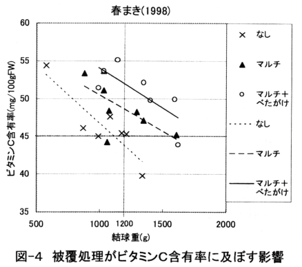 早春まきトンネルと春まきの作型において、マルチやべたがけを使用した区は使用していない区と比べ結球重が同じ場合は、ビタミンC含有率が常に高い(図-4)。