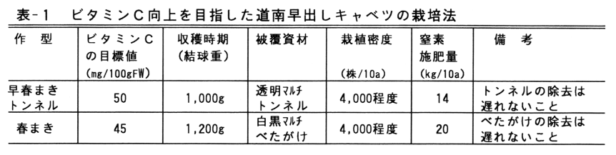 早出しキャベツのビタミンC含有率の目標値を早春まきトンネルにおいては50mg/100gFW、春まきにおいては45mg/100gFWする。その目標値を達成するためには、収穫時の結球重をそれぞれ1000g、1200gにし、マルチおよびべたがけを使用し、栽植密度を4000株/10a程度、窒素施肥量はそれぞれ施肥標準である14、20kg/10a程度にとどめるべきである(表-1)。