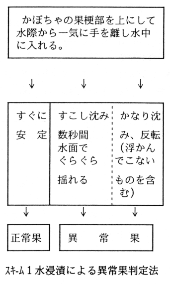 非破壊異常果判定法として水浸漬法(スキーム1)は、果実を水浸漬したときの安定性を3段階に分け、安定を正常果(適合率96.0%)、不安定および反転(浮かんでこないものを含む)をDBNによる異常果(適合率87.5%)と判定することが出来る。