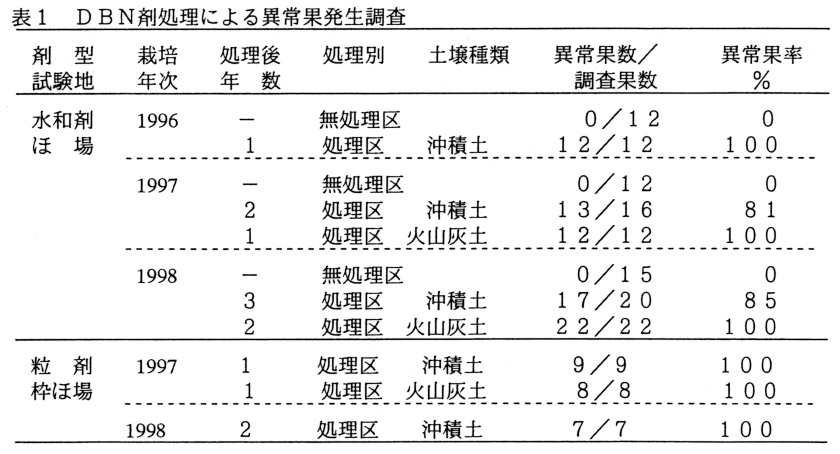 DBNによる異常果は、種子の形成が皆無が不完全であり、果肉内部に水浸状の白斑が認められ、異常果の多くは貯蔵性も劣り、内部成分として澱粉含量が低い傾向が認められた。
