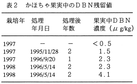作物残留分析法を改良して、DBNの検出限界濃度を0.5μg/kgにすることが出来る。これにより異常果に0.5μg/kg以上の残留を認めればDBNによると判断できる(表2)。