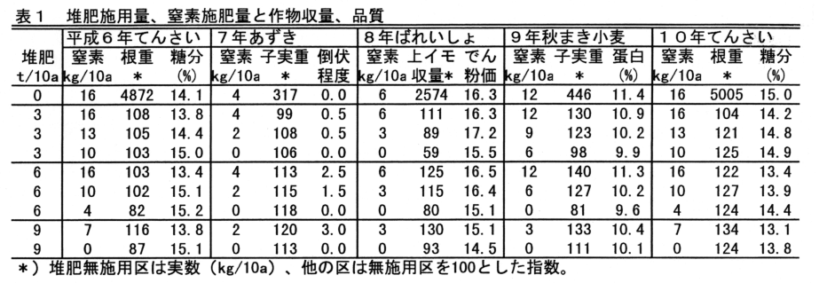 堆肥を連用した場合、全般に生育は旺盛となり、増収となる事例が多い。しかし、6t、9t連用ではてんさいのT/R比の増大、修正糖分の低下、ばれいしょでん粉価の低下、あずきの過繁茂による倒伏などが認められた。したがって、堆肥の連用施用は3t/10a/年程度が限界である(表1)。
