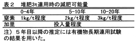 堆肥3t連用における窒素減肥可能量は、4年目くらいまでは1kg/t程度、5〜10年では2kg/t程度、10〜20年では3kg/t程度である。加里については堆肥に含まれる加里含有量を評価し、投入量程度の減肥が可能である。(図2、表2)