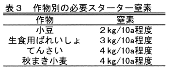 堆肥施用に伴い基肥窒素量を減らすと、窒素欠乏により初期生育が不良となる危険が大きい。したがって、あずきでは2kg/10a程度、生食用ばれいしょでは3kg/10a程度、てんさい・小麦では4kg/10a程度のスターター窒素の施用が必要である(表3)。
