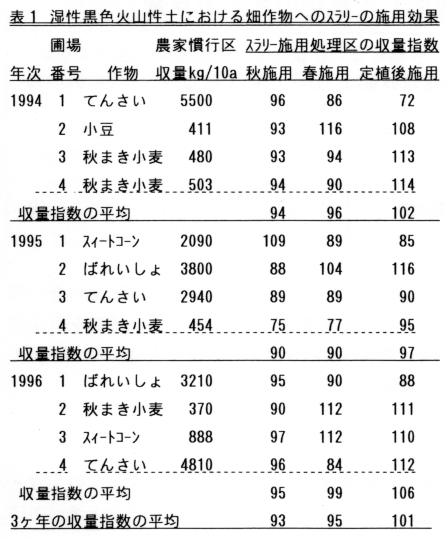 畑作物に対するスラリー中の春施用、播種後表面施用の肥効は高いが秋施用はやや肥効が劣る(表1)。