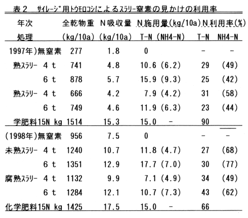 サイレージ用トウモロコシに対して春施用の場合、スラリー中全窒素(T-N)の吸収利用率(肥効率)は25〜43%、含有するアンモニア態窒素(NH3-N)の肥効率は42〜77%で、スラリーの未熟、腐熟による肥効率の差はない(表2)。