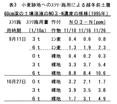 9月中旬の裸地へのスラリー散布により、越冬前の下層土壌溶液の硝酸態窒素濃度は10ppm(飲料水基)準以上となる。また地温の低下した10月下旬の裸地への散布でも下層土壌溶液の硝酸態窒素濃度は10ppmは越えないものの明らかに上昇する(表3)。したがって秋の裸地へのスラリー散布はしてはならない。