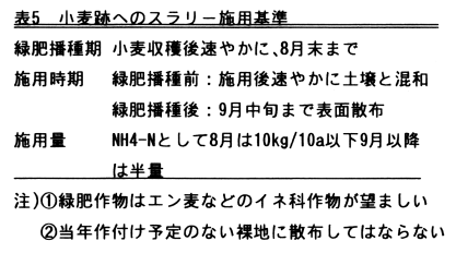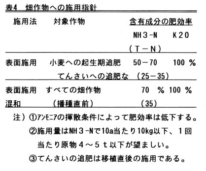 スラリー中窒素の畑作物に対する肥効率は全窒素では35%程度、アンモニア態窒素では70%程度で化学肥料を代替しうる。秋まき小麦収穫跡地への施用はエン麦などの緑肥の作付けが必須で9月中旬までである。当年作付け予定のない裸地への施用は硝酸態窒素の流亡を招くの避ける。