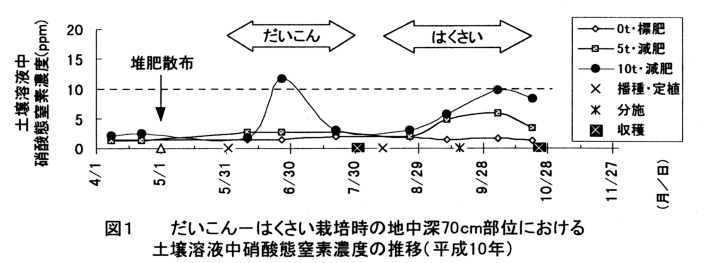 各種野菜を組み合わせた年2作栽培における堆肥の単年施用時の、窒素減肥を前提とした施用限界量は、収量からみて、前作では5t/10a、後作では10t/10aである(表2)。しかし、10t/10a施用では土壌溶液中の硝酸態窒素濃度(NO3-N)が厚生省の基準値である10ppmを越えることもある(図1)。したがって、環境負荷を考えた場合、年2作栽培時には概ね5t/10aが施用限界量である。