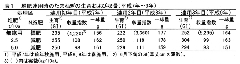 堆肥からの窒素放出量(残効含む)の減肥を前提とした連用時の施用限界量は、たまねぎの生育・収量(表1)および窒素負荷量からみて、概ね2.5t/10a/年である。また、堆肥施用に伴うタネバエによる被害を回避する上で、前年秋施用が基本的に望ましい。