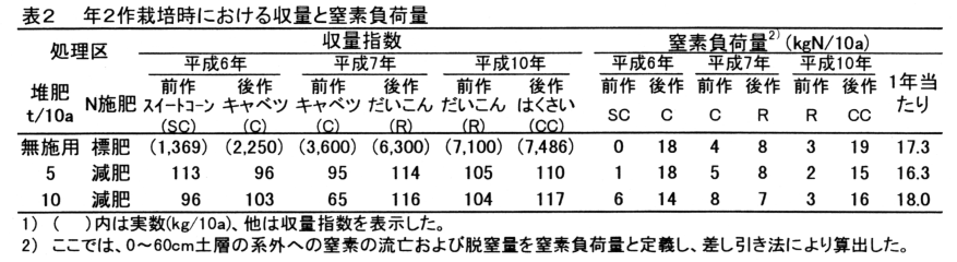 年2作栽培時の堆肥施用は、一度に5t/10aを春施用し、前・後作に対する堆肥の寄与はそれそれ同等の2.5t/10a分と評価し、前・後作の窒素減肥量を設定する。年2作栽培において堆肥5t/10a/年を連用しても、収量の低下および窒素負荷量の増加等が認められなかったことから、連用は可能である。