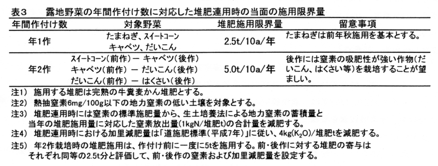 以上の結果および既往の知見を勘案し、露地野菜の年間作付け数に対応した堆肥連用時の当面の施用限界量および留意事項を表3に示す。