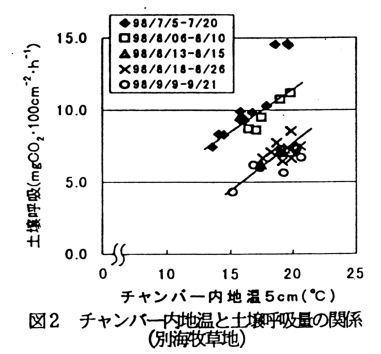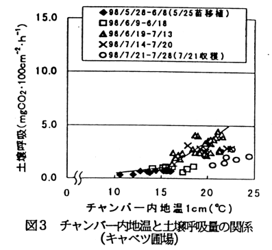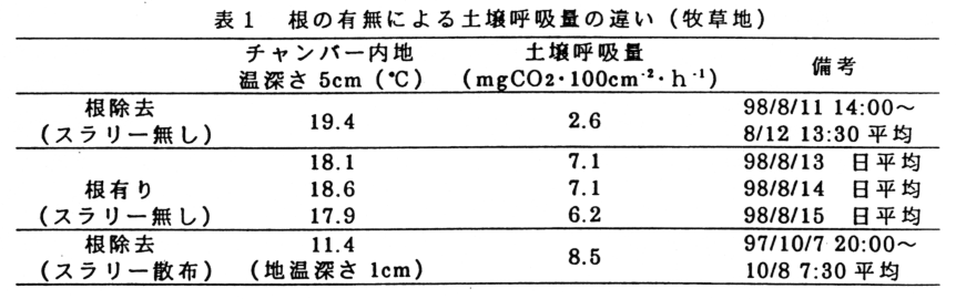 研究課題名:農地における水蒸気等の収支と循環に関する研究 予算区分 :経常 研究期間 :平成10年度(平成6〜10年度) 発表論文等:土壌面での炭酸ガスフラックス測定−土壌呼吸計測システムの開発と観測結果−,開発土木研究所月報,544号,p.11〜15,1998