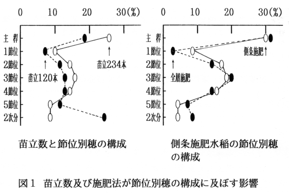 収量は栄養生長中期(4〜6葉展開期)の生育経過に最も影響され、好適生育相の獲得には1〜4節位の下位分げつ、特に1〜2節位分げつの確保が大切である。また、苗立数が200本/m2以下では下位節位穂の構成割合が少なく、2次分げつ穂が著しく多くなるため生産は不安定である。側条施肥すると全層施肥にくらべて1〜4節位の下位分げつ穂構成割合が高まり、とくに1節位穂が多く確保される(図1)。