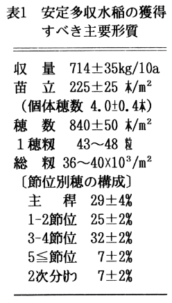 苗立ち密度は200〜250本/m2、穂数790本/m2以上、籾数3.6〜4.0万粒/m2、登熟歩合80%以上確保を目標とする。節位別穂の構成は、主稈と下位節位穂(1〜4節位)で86%程を確保し、5節位以上の分げつ穂や2次分げつ穂を少なくする(表1)。