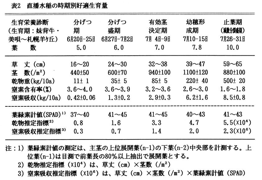 好適生育量は、6葉期で茎数600本/m2、乾物35kg/10a、茎葉の窒素含有率は3.6〜3.9%(葉緑素計値41〜45)程度である。有効茎決定期(7葉期)では、茎数940本/m2、乾物85kg/10a、窒素吸収2.9kg/10a、窒素含有率3.2〜3.6%(葉緑素計値41〜45)が好適である。この時期の葉緑素計値が38以下の場合は下位分げつや1穂籾数が少なくなる(表2)。