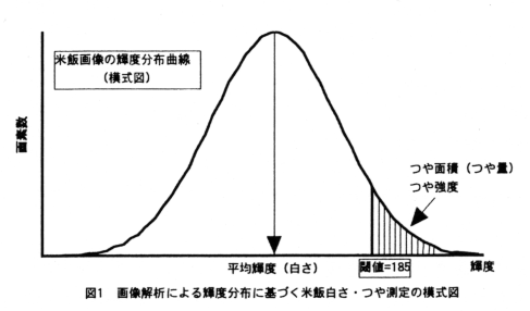 米飯のつやは周辺部に比較して高い輝度を持ち、この輝度領域(輝度185以上)の面積および強度(つや領域の平均輝度)がつやを評価するパラメータになる。