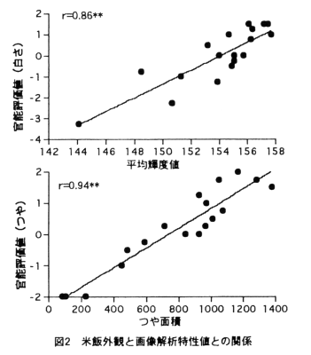 官能評価による米飯の白さおよびつやは、画像解析による平均輝度値およびつや面積と密接な関係が認められた(図2)。