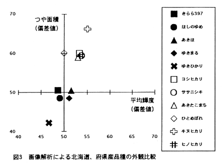 北海道うるち品種は、白さの点で府県産品種に近づいていると評価できるが、つやに関しては明らかに劣っており、この点が外観上の重要な改善点であると考えられる(図3)。