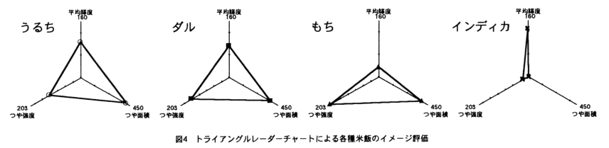 ダル、インデイカ系統を含む集団では、つや面積と強度に相関関係ははないことから、これらの米の外観は、つや強度を含めたトライアングルレーダーチャートにより特徴が表現できる(図4)。