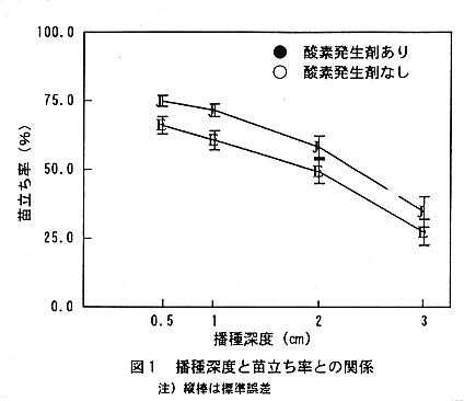 - 苗立ち率は播種深度が深くなるにつれて低下し、とくに、播種深度が3pでは大きく低下する。また、播種深度が深くなると酸素発生剤の効果も低減する(図1)。