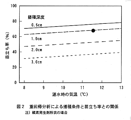 - 重回帰式によると(図2)、苗立ち率は湛水期が遅れると徐々に高くなり、播種深度が深くなると急激に低下する。また、酸素発生剤は苗立ち率を9%程度高める効果が認められる。