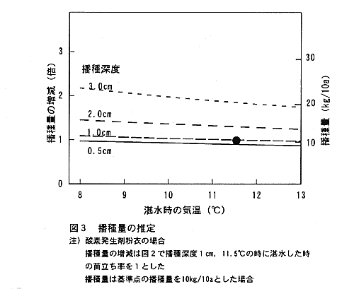 - 播種深度が1pで、酸素発生剤を用いて気温が11.5℃の時に湛水した場合の苗立ち率(68%)を基準として、異なる播種条件下での苗立ち率との比率を求めることにより、播種量の増減割合や適正な播種量を推定することができる(図3)。