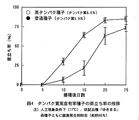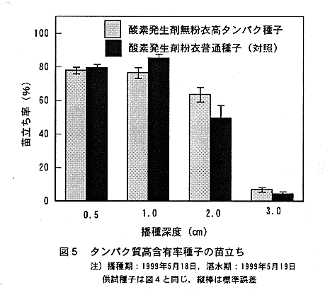 - 発芽・苗立ちが高められるタンパク質含有率が高い種子の寒地乾田直播への適用をみると、高タンパク種子の苗立ち率は酸素発生剤を粉衣しなくとも粉衣種子と同等程度となり、特に播種深度が深くなった場合に効果的になることが示された(図4、5)。