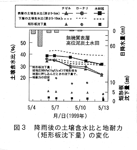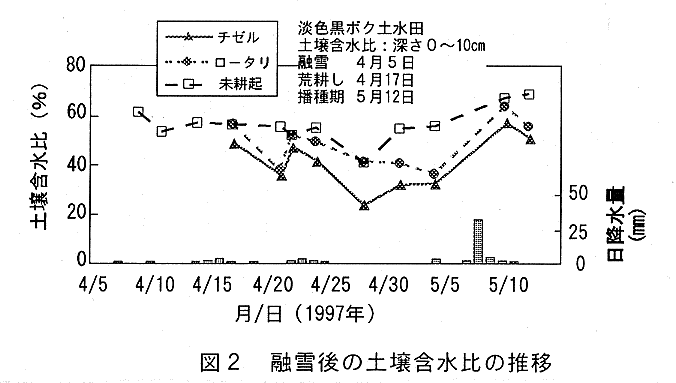 - 融雪後、チゼルプラウで荒起しを行うと爪で耕起された部分は細かく砕土され土塊の間隙が大きく、爪と爪の間の部分は土塊が大きい構造となり、通気性や排水性が向上することにより、ロータリ耕起やまったく荒起しをしない未耕起に比べて土壌水分が早く低下する(図2)。また、降雨後はロータリ耕起のように下層の土塊の間隙に保水することがなく、表層および下層とも土壌水分が短期間に低下する(図3)。