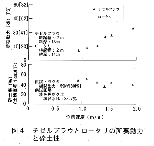 - ロータリは作業速度が上がると耕うんピッチが大きくなり砕土性が低下するが、チゼルプラウは砕土性の低下が少なく、トラクタの出力に応じて作業速度を速めることができる。同一出力のトラクタであればチゼルプラウはロータリの約2倍の速度で作業が可能で、作業能率が高い(図4)。