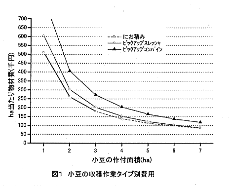 - 小豆のピックアップスレッシャ収穫またはピックアップコンバイン収穫で大幅に労働時間が減少する。機械収穫は、にお積みとの比較で同じ作付面積では物財費が高くなるが、にお積みでの限界面積以上の作付けが可能となる(図1)。小豆のピックアップ収穫は、ごぼうの作付拡大に寄与するとともに、小豆の作付拡大を可能にする。小豆のピックアップ収穫により、小豆とごぼうの合計面積は、にお積み収穫の3ha前後から6ha前後へと3ha程度拡大し、単位面積当たり収益の高い作物を選択しやすい状況がつくられる。これにより農業所得は50〜60万円増加する(表2)。