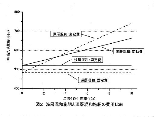 - ごぼうの浅層混和施肥では、労働時間の削減はないが、施肥量が減少し、資材費が低減するため(図2)、所得は向上する。
