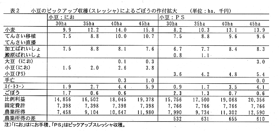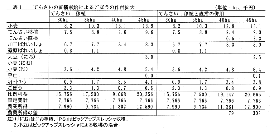 - てんさいの直播栽培では春期労働は大幅に軽減されるが、移植栽培との単収差がある。現行価格で12.5%の単収差とすると、てんさい作付面積2ha以上では移植が有利である。てんさいの直播栽培は、小豆のピックアップスレッシャ収穫を前提とした場合、耕地面積40〜45haの経営でごぼうの作付の増大を可能とし、農業所得が若干増加する(表1)。