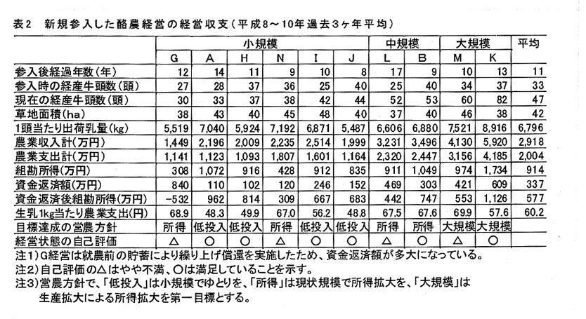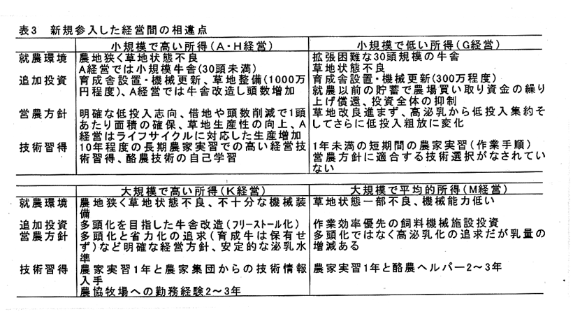 - 小規模で高所得の経営(A・H)は、長期実習等による技術習得の上で低投入方式を志向した。低所得の経営(G)は、牛舎が狭小かつ拡張困難で十分な所得が得られなかった。そこで低投入方式への転換を図ったが、草地の低生産性や技術的問題から、十分な経営成果は得られていない(表3)。大規模で高所得の経営(K)は、多頭化による所得追求を明確な指針とし、フリーストール施設の導入を重視した。平均的な所得の経営(M)は、必ずしも明瞭ではなく、追加投資として飼料作機械の更新を重視し、その後の生産拡大が遅れた。