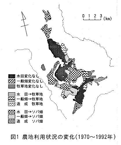 - 減反政策により、農地の大部分を占めていた水田が大きく減少するとともに、一般畑も減少し、ソバ畑と牧草地が増加している(図1)。耕作放棄地はほとんど生じていない。