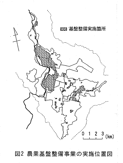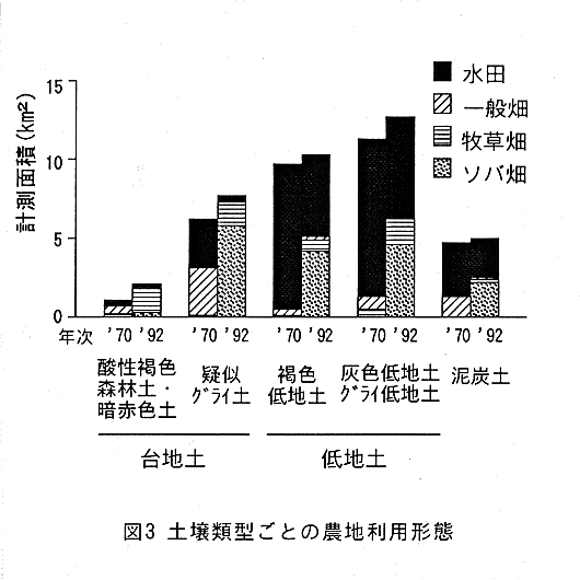 - 水田が残っている地域は大規模な農業基盤整備(図2)がなされていて、その土壌は低地土であり、反対に、台地土に分布した水田はほとんどがソバ畑や牧草地に転換されている(図3)。低地土の水田で転換されたものは、農家数の減少が特に著しい集落に属すか、または通作距離が長い。