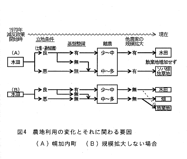 - 幌加内町南部地域での1970〜1992年の農地利用形態の変化は、水田減少とソバ畑・牧草地の増加であった。水田の継続利用には土壌型と通作距離や農業基盤整備等が、耕作放棄地の発生抑制には幌加内町としてのソバ栽培の振興が要因になっている。