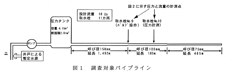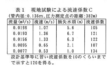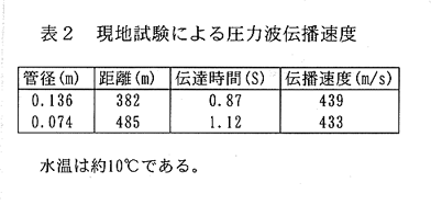 - パイプライン上の2点間で測定した圧力波の伝播時間と損失水頭によると、ポリエチレン管における圧力波伝播速度は約440m/sであり、またヘーゼン・ウィリアムス公式の流速係数Cは約120である(表1、表2)。圧力波伝播速度は管種ごとの水撃現象を特徴づける値であり、ポリエチレン管では材料のヤング係数から求められる300m/s前後の値が一般的であるとされているが、試験結果によればこれよりも大きく、塩化ビニール管の伝播速度に近い速度である。