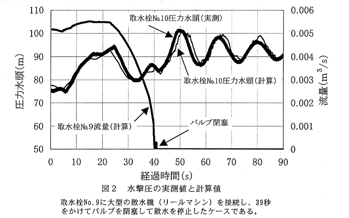 - 既存の中心差分法による水撃圧シミュレーションに、この実験で得られた圧力波伝播速度と流速係数を適用すると、実際の管路で生じる水撃現象は精度よく再現できる(図2)。各種パイプラインをモデル化しこの計算手法を適用すれば、さまざまなバルブ操作を想定した場合の水撃圧を精度よく予測できる。