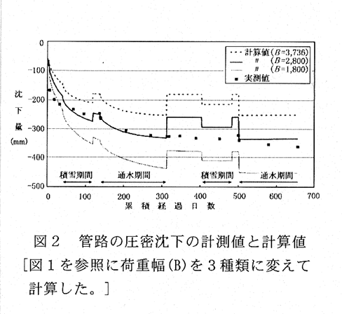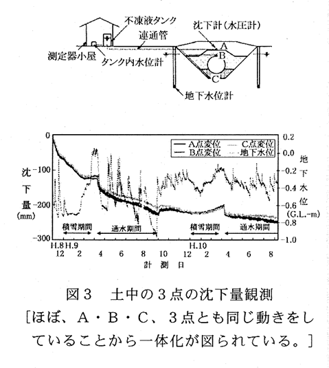 - 管周囲の土をセメント系固化材(超高有機質土用)で改良し、管基床部での荷重分散を図り、管路の沈下量を軽減する。また、地下水位の急上昇による管路の浮上を固化した管上部土塊の重量で抑止する(図1 図2 図3)。