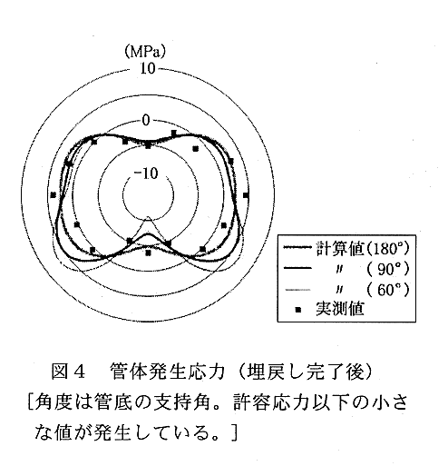 - 基礎材および周囲土の反力係数(e')を増加し、管のたわみ・応力を軽減する(図4)。