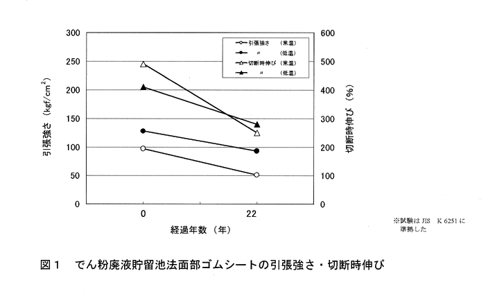 - 敷設から22年経過したでん粉廃液貯留池法面部のゴムシート(厚さ2mm)の引張強さは、常温下で約5.0MPa(51kgf/cm2)、低温下で約9.1MPa(93kgf/cm2)であり、初期の強度に比べ47%、27%程度減少している。また、切断時の伸びは常温下250%、低温下280%と初期の伸びに比べ49%、32%程度減少しているものの、常・低温下においても伸び特性は維持されている。