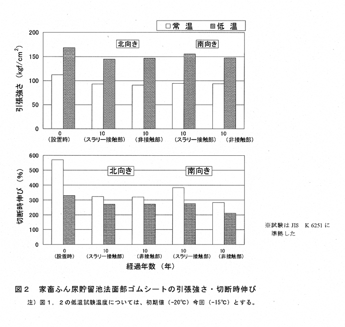 - 敷設から10年経過した家畜ふん尿貯留池法面部(北・南向き)の貯留面上・下部より採取したゴムシート(厚さ1mm)は、初期値に比べ、引張強さが10〜20%減少し、伸びが40%減少している。引張強さは、初期値に比べ10〜20%程度減少している。