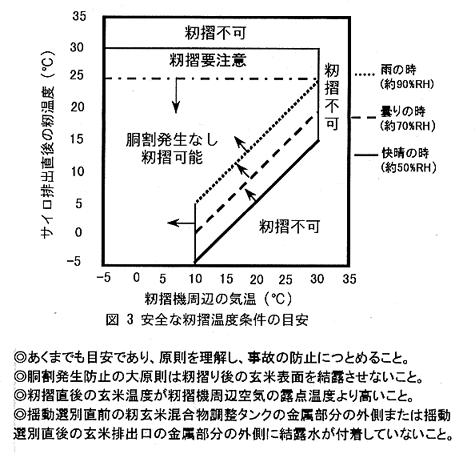 - 排出時の籾温度が気温に近い時は直接籾摺でも玄米に胴割は生じない。籾温度が低い時でも揺動選別前後の玄米温度が籾摺機周辺空気の露点温度よりも高ければ胴割は発生せず、低い場合は籾の昇温が必要である。胴割を防止するには露点温度計で籾摺機周辺の露点温度を直接測定して判断することが望ましいが目安として図3を使用できる。