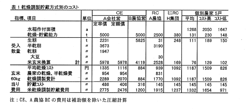 - 農家の個人乾燥、営農倉庫での貯蔵とカントリーエレベータによる乾燥調製貯蔵のコストを比較すると、カントリーエレベータの貯蔵コストは高い。乾燥から貯蔵、出庫までの総コストを低くするには、カントリーエレベータの利用に関わる水稲の栽培・収穫作業の組織化や籾殻堆肥化事業などを組み合わせ、費用割合の多い人件費の節減を図り、乾燥調製コストを低くすることが重要である(表1)。
