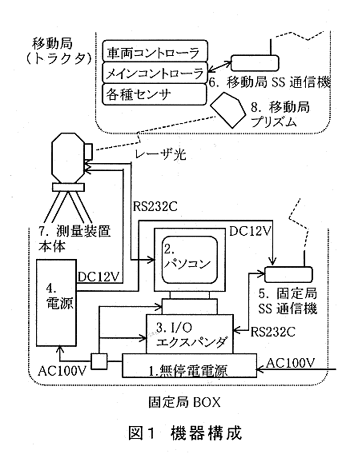 - 自律走行トラクタ(XNAV方式)はレーザ光による自動追尾型光学測量装置(追尾角度10deg/s、測位精度10mm)と特定小電力無線通信を利用したシステム(図1)により、無人走行が可能である。