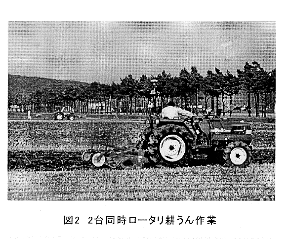 - 自律走行トラクタを利用することにより、オペレータは作業を監視しながら、同時に他の作業を行うことができる(図2)。2台のトラクタを使用する2台同時運用作業の圃場作業量は慣行の約2倍である。