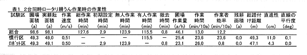- 作業幅172cmのロータリを用い、50aの長方形圃場において作業速度0.5m/sで耕うん作業を行った結果、残耕もなく、26min/10aの作業時間で作業が可能である。目標ラインからのずれは5cm以内でオペレータによる慣行作業より優れた(表1)。