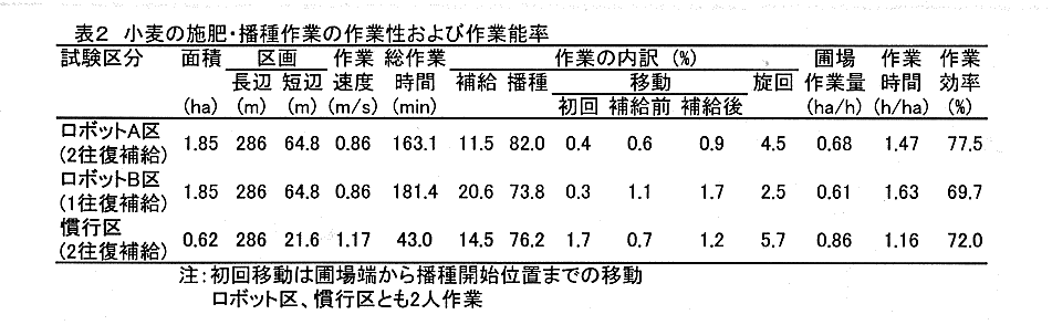 - 畦間30cmの9畦用施肥・播種機を用い、1.85haの長方形圃場で小麦播種試験を行った結果、1.47h/haの作業時間で播種作業が可能である(表2)。