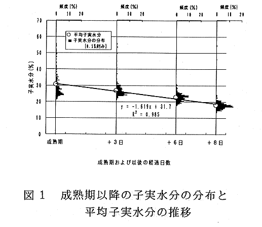 - 子実水分の平均乾燥速度は無加温通風乾燥では、0.15〜0.17%/h(風量比2.4m3/t・s)であり、無通風で5cmに堆積し1日に1回攪拌した場合では0.17〜0.19%/hである。加温通風乾燥では、低温であっても連続通風は品質に好ましくない。